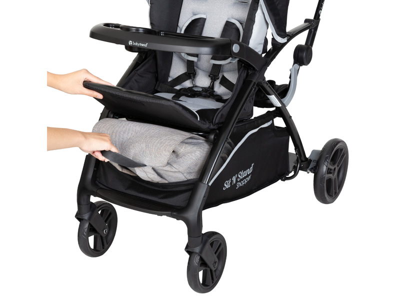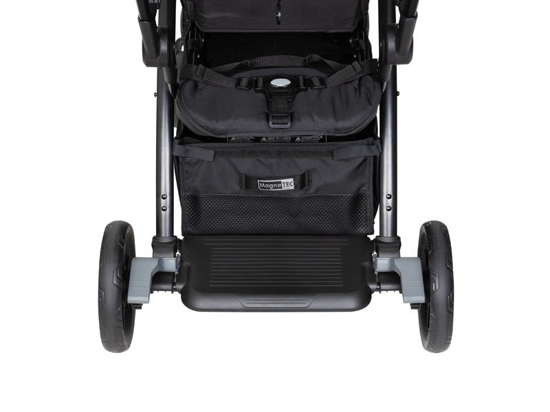 数秒で簡単に折りたたみ・自立置きできる2人乗りベビーカー。子供2人と外出するときに最適、後席はシートとフットボードがあるので座っても立っても乗ることができる。大容量のアコーディオン式収納で買い物にも大活躍。