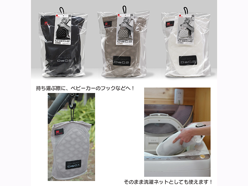 芯材とベルトの新構造で体への負担を大幅に軽減したヒップシート。パッケージはメッシュ生地の収納ポーチとなっており、たたんで持ち運びに便利なDaGならではの仕様となっている。また、収納ポーチは洗濯ネットとしても使用可能なのもポイント。