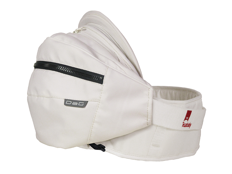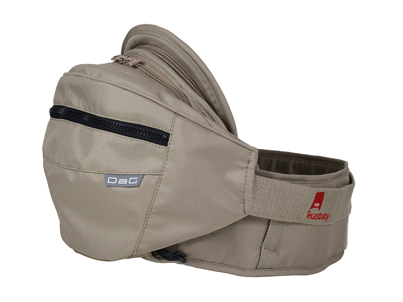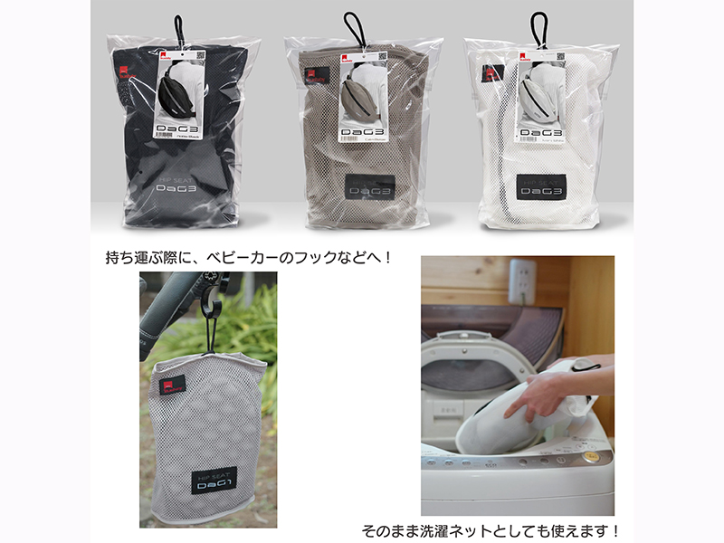 お尻拭き、おむつ、お財布など、ちょっとしたお出かけの荷物が収納可能。背当てもついているので子供が寝てしまっても安心。ヒップシートの「かさばる! 食い込む!」を解消した仕上がりなのが特徴。収納ポーチは洗濯ネットとしても使用可能だ。